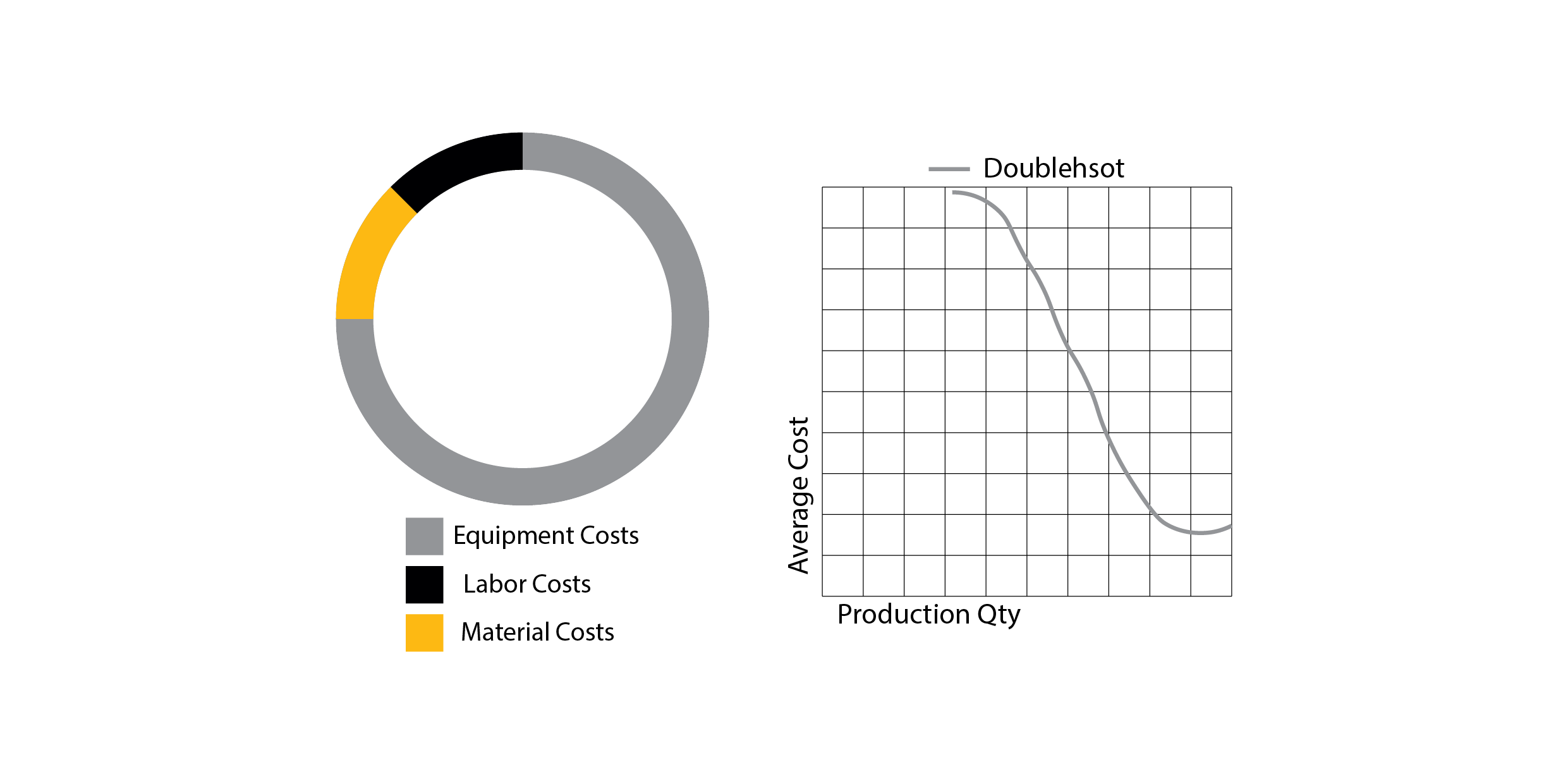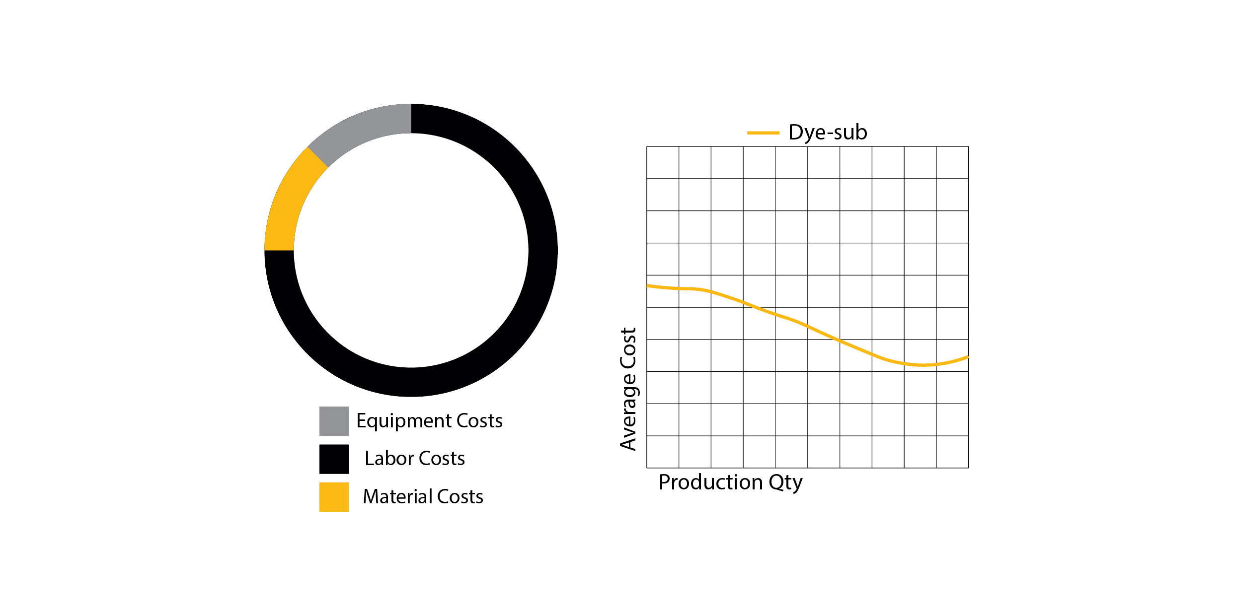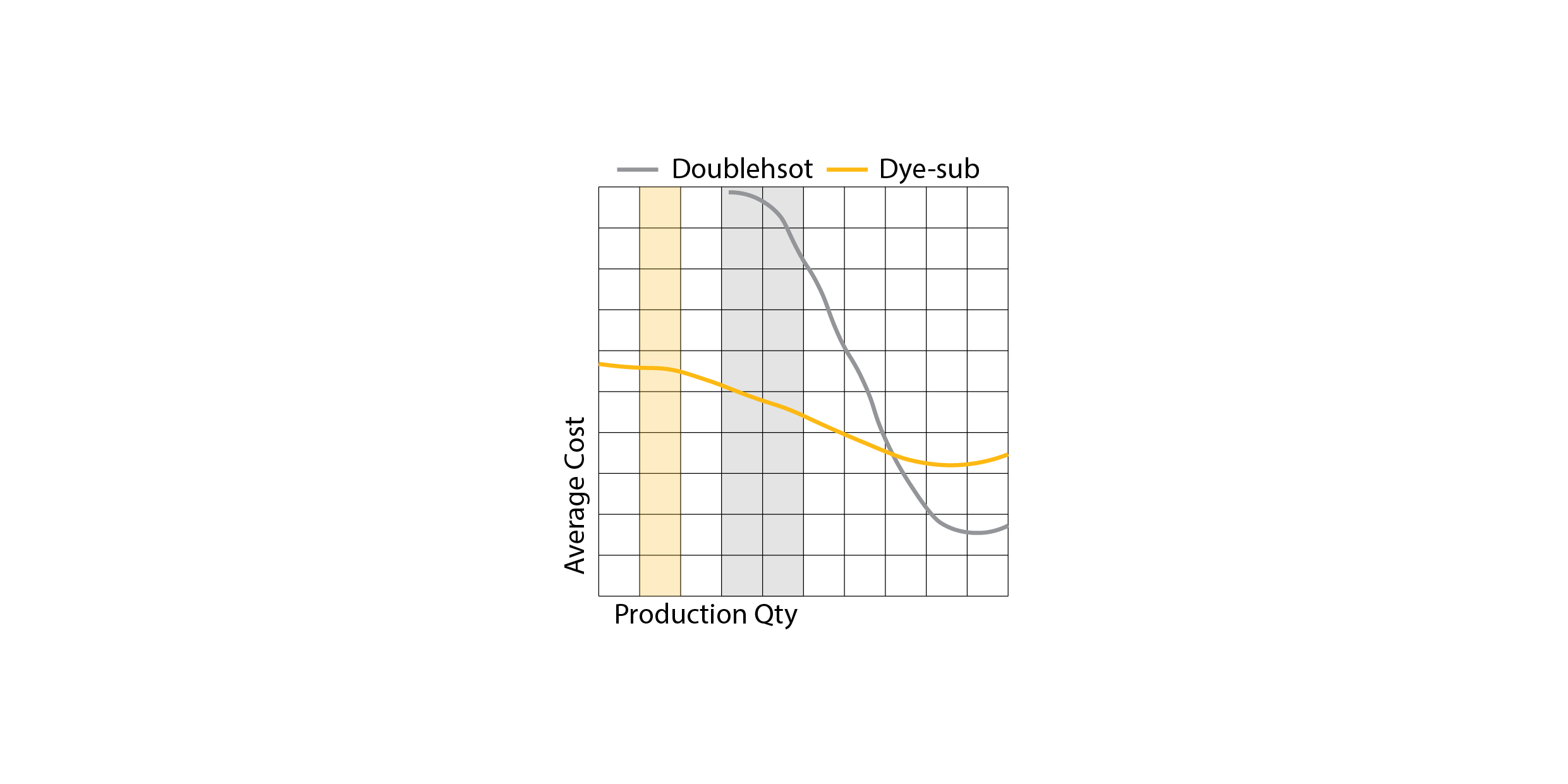 The shaded area represents the most common range for product volumes. It's evident that Doubleshot Keycaps are expensive due to the high cost of equipment and low demand, while Dye-sub Keycaps are expensive because of low yield and the inability to achieve large-scale production without significant manual labor.