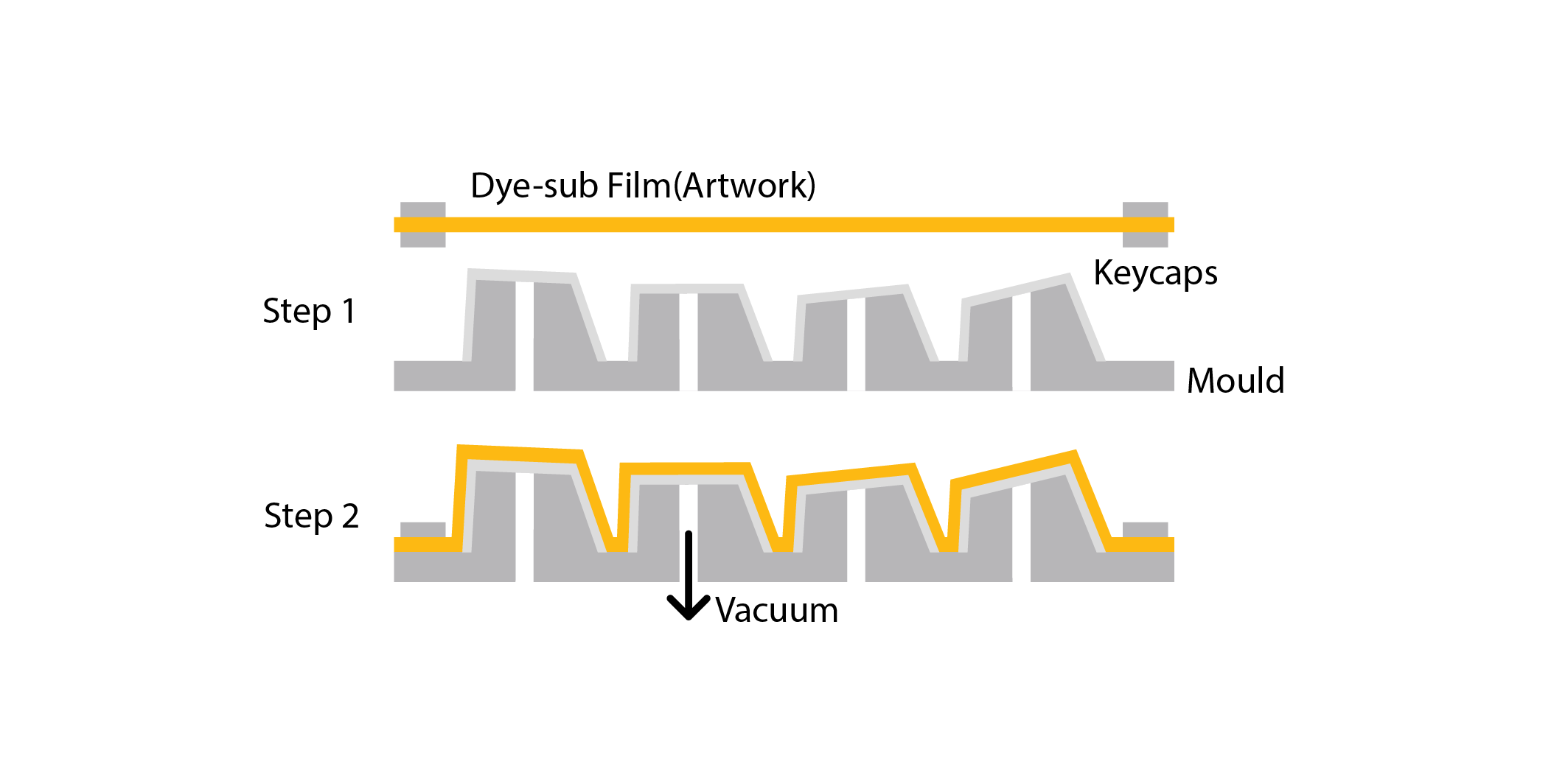 The minimum order quantity for Dye-sub keycaps is relatively low because sublimation is done using a printer, and it doesn't require the creation of custom molds during production. However, Dye-sub keycaps have unpredictability during the vacuum forming process (there will always be displacement during shrinkage), and most of the processes rely on manual labor. Therefore, variable costs are much higher compared to fixed costs.